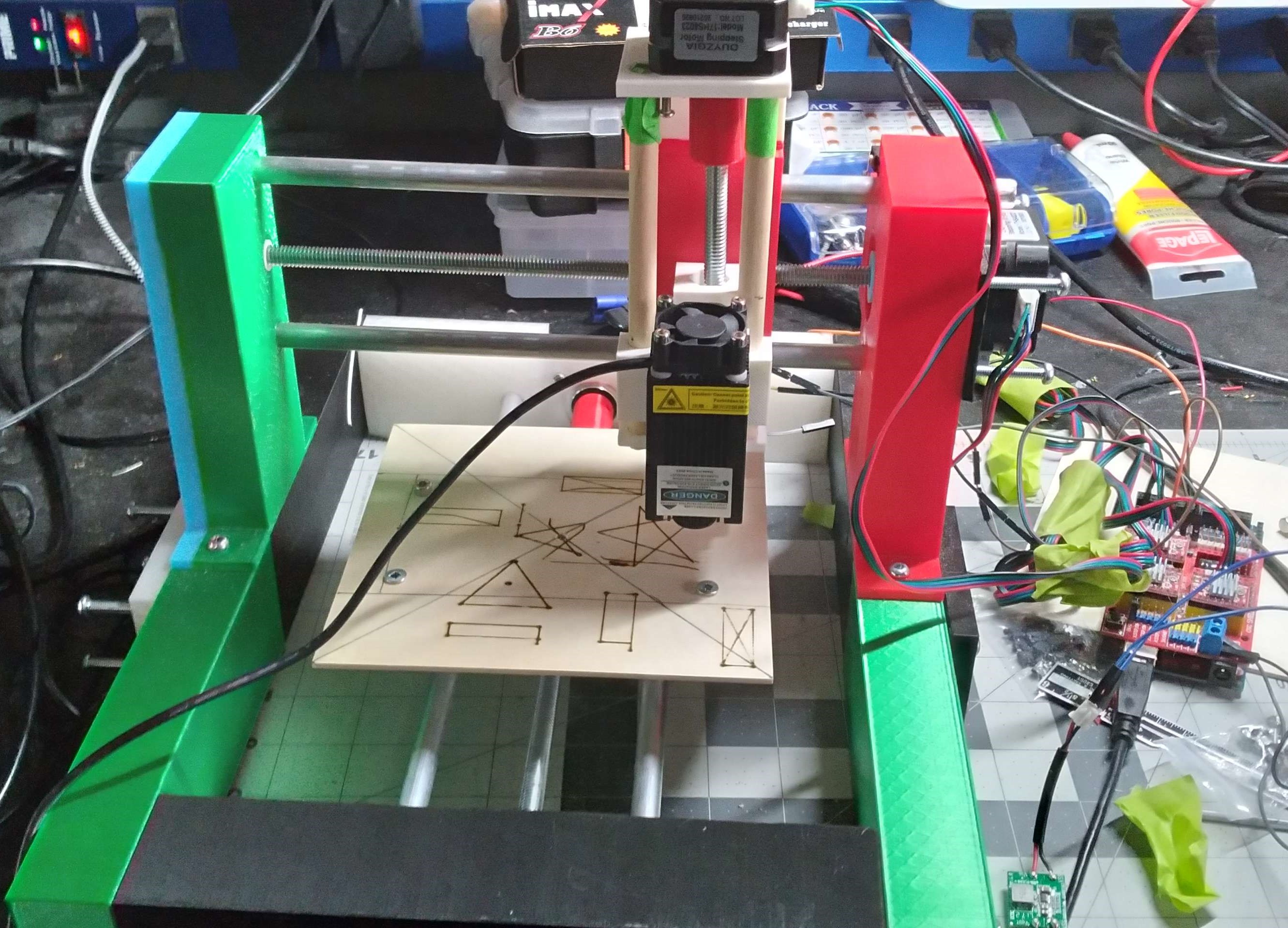 Here we have a laser engraving machine that can burn simple shapes into wood. Although I never finished this project, I still made impressive progress. This project challenged me in many aspects from modeling the right parts for the electronics, to applying the right math required to draw certain shapes. Currently, it can only draw lines, my original plan was to have it draw complex shapes like circles or parabolas, but my math skills in Grade 9 weren't good enough.