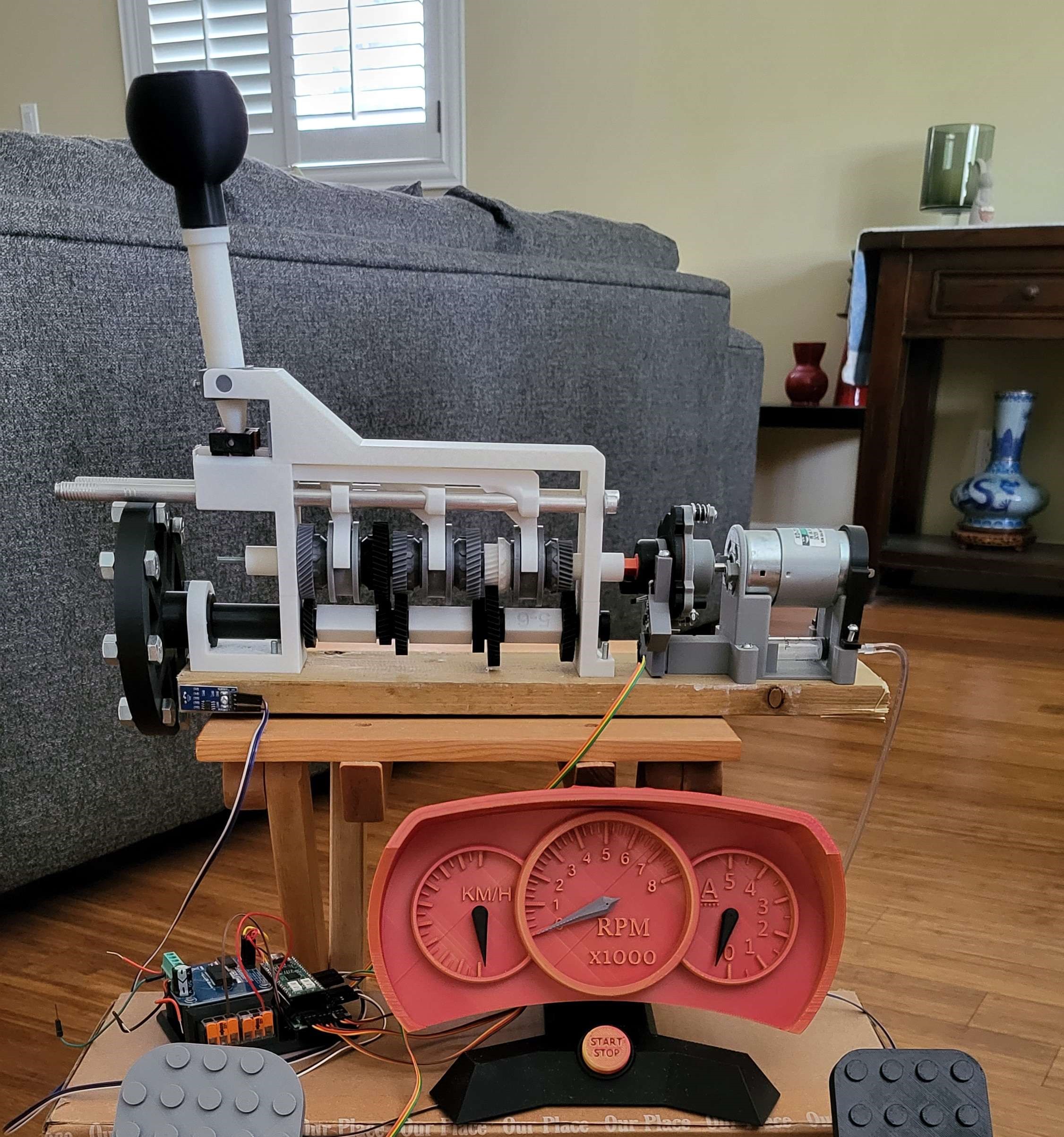 Mainly my specialties are related to electronics and programming, not mechanical. With this project, I wanted to take a risk and try making something heavily mechanical related. What I ended up making is a 6 speed manual transmission with a hydraulic clutch, mechanisms that can be found inside manual drive vehicles. I also realized I needed to make a tachometer and pedals to test the functionality of my transmission.